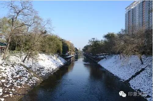 道路旁,金水河岸边的积雪还在,清澈的河水缓缓流动,映着雪光、阳光,美妙动人。河畔旁带着点点白雪的柳树经风一吹,积雪飘落,洒在河面上,一晃就随着水流沉入飘走。