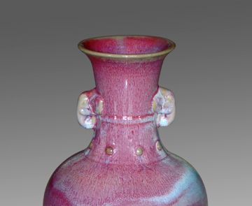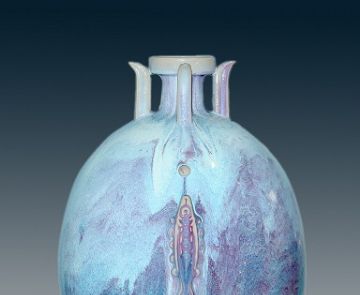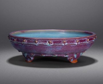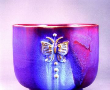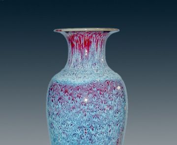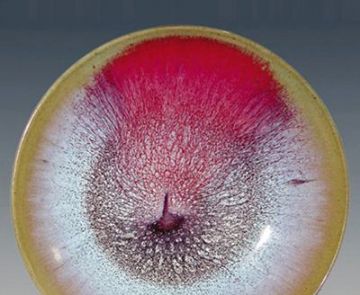 钧瓷窑变是天地造化,人意不可为,是钧瓷艺术的典型代表。但第三种又美又缺的釉色偏偏多有遗憾。其中,流釉严重的却有不少都会出现难得的釉变和釉色。如晋佩章大师窑口那种娇艳的偏粉色的胭脂红,美如桃花,其间杂以碧绿的翠色,再现了杏花春雨江南,天下同春之美色。可是,笔者却从来没有见过完整不流釉的作品。其间,笔者也数次问过晋老先生及其家人,他们都说能出现那种釉色而不流釉的没有,因为温度不高烧不出来,烧出来就流釉。其他窑口也有很多类似的情况,所以,那种少见的美釉即使出现点儿遗憾也应视为稀有品,不然这些美釉就绝了。