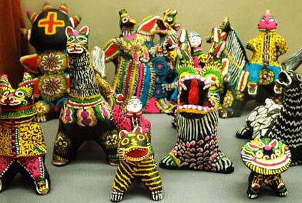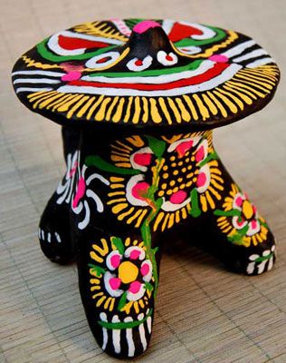 “泥泥狗”是一种黑色泥塑玩具,黑色上再施以红、黄、青、白色,色彩对比强烈,而又不失和谐。中国各地的泥玩具中白底色玩具极普遍,黑底色玩具较少。“泥泥狗”以黑为基调,再饰以红、青、黄、白,统称“五色”。红、青色艳丽,白为明色,黄则为中和色(现多用广告色、加品红),在黑色的包容中通体鲜艳夺目,具有强烈的视觉冲击效果。“五色”则源于中华民族的“五色观”,由来已久。《历代名画记》载“泊平有虞作绘”注引《蔡传》说:“彩者,青、黄、赤、白、黑色。色者,言施于僧帛也。绘于衣,绣于裳,皆饰‘五彩’,以为‘五色’也。”《画论》引《冬官考工记》载:“画缋之事杂五色;东方谓青,南方谓之赤,西方谓之白,北方谓之黑,天谓之玄,地谓之黄。”贾公彦疏曰:“天玄与北方黑,二者大同小异。”“古有墨分五彩之说。”五色条纹加上奇特的造型成为泥泥狗最大的特点。