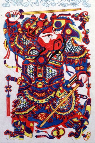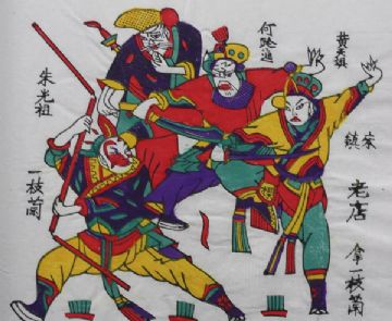 朱仙镇木版年画构图饱满,线条粗扩简炼,造型古朴夸张,色彩艳丽,对比强烈。画面人物头大身子小,形象夸张,既有喜剧效果又觉得匀称舒适。有些地方的年画人物脸部多打红脸蛋来妆饰,而朱仙镇的年画不打红脸蛋,看起来很自然和谐。年画题材以门神最多,大多严肃端庄。门神中以秦琼、尉迟敬德两位武将为主。那些大大小小的门神画中,两位武将或衣着不同,或形态各异:步下鞭、马上鞭、回头马鞭、抱鞭、竖刀、披袍等,不下20种样式。