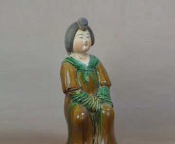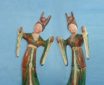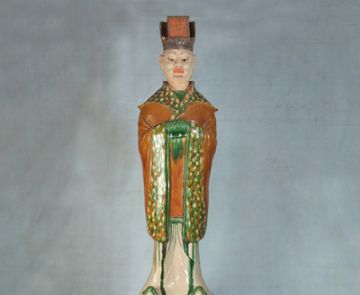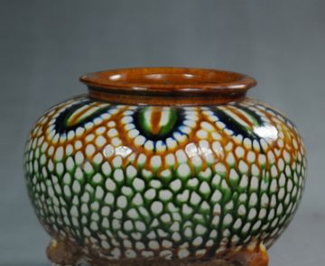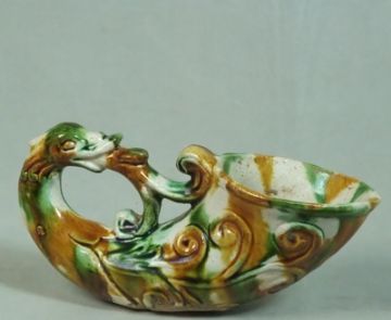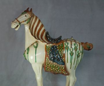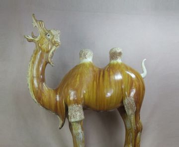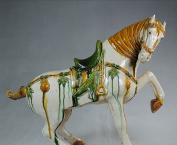 唐三彩器物形体圆润、饱满,与唐代艺术的丰满、健美、阔硕的特征是一致的。唐三彩的造型丰富多彩,一般可以分为动物、生活用具和人物三大类,而其中尤以动物居多。三彩人物和动物的比例适度,形态自然,线条流畅,生动活泼。在人物俑中,武士肌肉发达,怒目圆睁,剑拔弩张;女俑则高髻广袖,亭亭立玉,悠然娴雅,十分丰满。动物以马和骆驼为多。