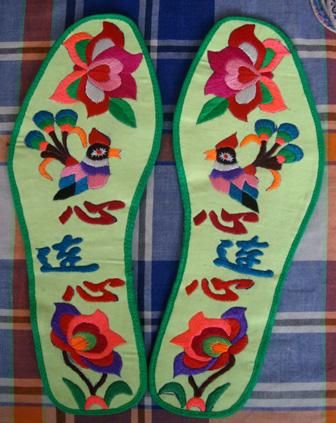 在民间,手工刺绣鞋垫也将是表达爱情的一种方式,有一种风俗:男方相亲,如女方答应这门亲事,将会送给男方一双自己做鞋垫(即手工刺绣鞋垫);在女孩子出嫁时,鞋垫也将是自己的嫁妆,一是将证明自己的心灵手巧,二是希望自己所做的鞋垫能给自己与丈夫带来好运。