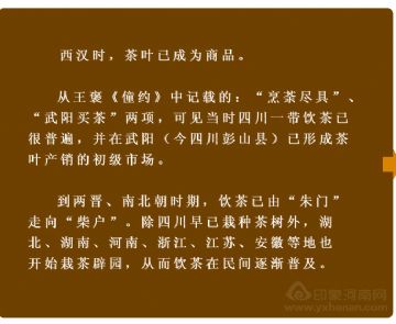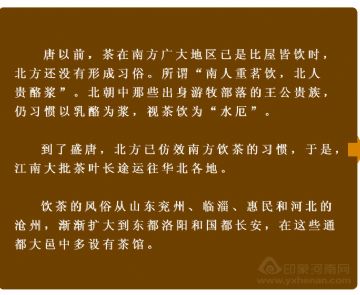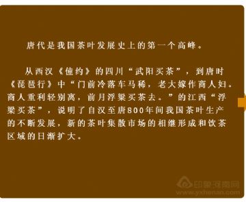 茶在唐代达到了我国茶叶发展史上的第一个高峰。从西汉《僮约》的四川“武阳买茶”,到唐时《琵琶行》中“门前冷落车马稀,老大嫁作商人妇。商人重利轻别离,前月浮粱买茶去。”的江西“浮梁买茶”,说明了自汉至唐800年间我国茶叶生产的不断发展,新的茶叶集散市场的相继形成和饮茶区域的日渐扩大。唐以前,茶在南方广大地区已是比屋皆饮时,北方还没有形成习俗。所谓“南人重茗饮,北人贵酪浆”。北朝中那些出身游牧部落的王公贵族,仍习惯以乳酪为浆,视茶饮为“水厄”。到了盛唐,北方已仿效南方饮茶的习惯,于是,江南大批茶叶长途运往华北各地。饮茶的风俗从山东兖州、临淄、惠民和河北的沧州,渐渐扩大到东都洛阳和国都长安,在这些通都大邑中多设有茶馆。
