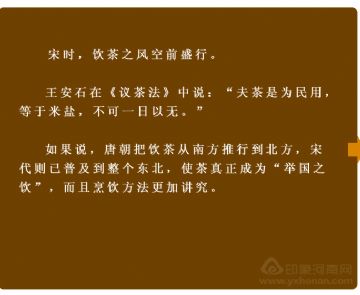 宋时,饮茶之风空前盛行。王安石在《议茶法》中说:“夫茶是为民用,等于米盐,不可一日以无。”如果说,唐时把饮茶从南方推行到北方,宋代则已普及到整个东北,使茶真正成为“举国之饮”,而且烹饮方法更加讲究。