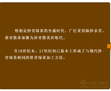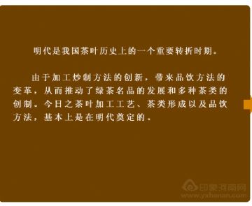 明代是我国茶叶历史上的一个重要转折时期。由于加工炒制方法的创新,带来品饮方法的变革,从而推动了绿茶名品的发展和多种茶类的创制。今日之茶叶加工工艺、茶类形成以及品饮方法,基本上是明代奠定的。