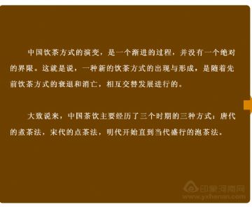 大致说来,中国茶饮主要经历了三个时期的三种方式:这就是唐代的煮茶法,宋代的点茶法,明代开始直到当代盛行的泡茶法。