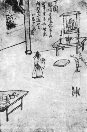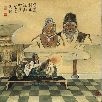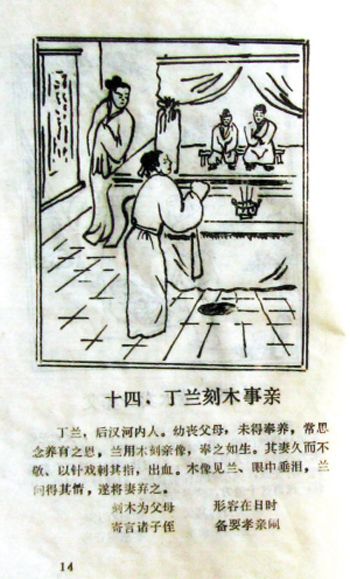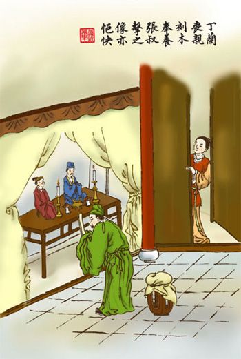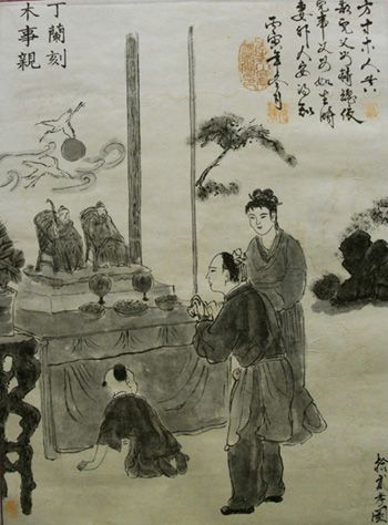 丁兰“刻木为像”,表达对父母的哀思, 事事叨念父母亲的 “劬劳之恩”, 其爱之深, 不言而喻。关于《丁兰刻木》,有着不同风格的作品。