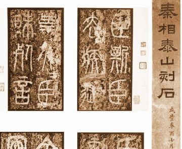 《泰山刻石》立于始皇二十八年(公元前219年),是泰山最早的刻石。前半部系公元前219年秦始皇东巡泰山时所刻;后半部为秦二世胡亥即位第一年(公元前209年)刻制。