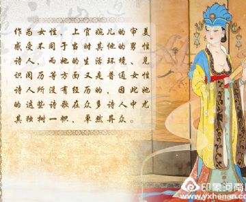 作为女性,上官婉儿的审美感受不同于当时其他的男性诗人,而她的生活环境、见识阅历等方面又是普通女性诗人所没有经历的,因此她的这些诗歌在众多诗人中尤其独树一帜,卓然异众。《龙城录》里有对上官婉儿的诗歌作“绝丽”之评,这位才华绝代而创作丰赡的诗人,玄宗曾下令汇集她的诗文,撰成《唐昭容上官氏文集》20卷,诏燕国公张说题篇,可惜已散佚。《全唐诗》中今存诗32首,按内容大致可分为三类:一为抒情述怀,一为应制奉和,一为出游纪胜。