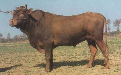 郏县红牛体格中等大小,结构匀称,体质强健,骨骼坚实,肌肉发达。后躯发育较好,侧观呈长方形,具有役肉兼用牛的体型,头方正,顿宽,嘴齐,眼大有神,耳大且灵敏,鼻孔大,鼻镜肉红色,角短质细,角型不一。被毛细短,富有光泽,分紫红、红、浅红三种毛色。