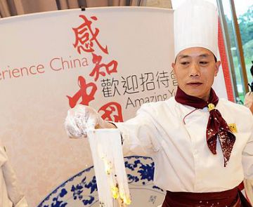 8月27日,在日内瓦万国宫,来自河南的面点大师乔增广展示自己的拉面绝活。他可将一团面团拉抖18次,抻出共计超过25万根细如发丝的拉面来。