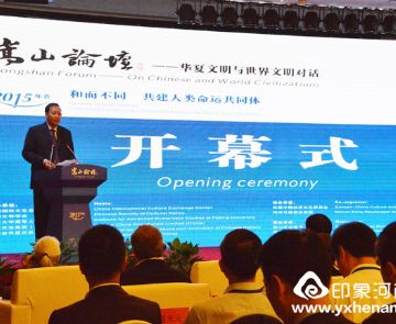 嵩高维岳,峻极于天。天地之中,锦绣登封,文明的对话在此展开。由中国国际文化交流中心、中国文物学会、北京大学高等人文研究院、建业住宅集团(中国)有限公司、河南省华夏历史文明传承创新基金会联合主办,欧盟中国经济文化委员会、河南日报报业集团协办,嵩山论坛秘书处、河南省国际文化交流中心承办的“嵩山论坛——华夏文明与世界文明对话”2015年会于9月12日上午在登封市隆重开幕。全国人大常委会副委员长张宝文,意大利科森扎省省长马里奥•奥基乌托,河南省人民政府副省长张广智,中国国际文化交流中心秘书长丁奎淞等出席开幕式。河南省委宣传部常务副部长王耀主持开幕式。