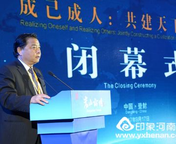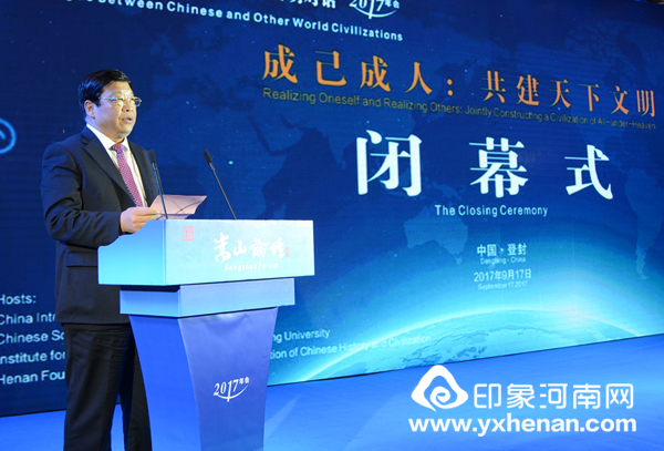闭幕式上,省政协党组副书记、副主席张广智在致辞中讲到,从2012年至今,嵩山论坛紧紧围绕“华夏文明与世界文明对话”这条主线,把不同国度、不同文明、不同文化的专家学者“请进来”共同开展世界多元文明的对话交流,共同研讨华夏文明与世界文明的传承创新,共同弘扬文明传承创新的重要成果,努力推动“百花竞放、兼容并蓄、各美其美、美美与共”的世界文明的建设,努力构建人类命运共同体。在这个过程中,嵩山论坛与世界学术界、政府智库,以及有天下情怀和担当精神的社会各界精英结下了深厚友谊。张广智表示,虽然嵩山论坛2017年会落下帷幕,但是我们成己成人,追求卓越,构建世界文明的脚步远远没有止步。坚信嵩山论坛将以更加开放包容、丰富多样、经世致用的特质,在华夏历史文明传承与创新事业中实现更大作为。嵩山论坛将认真落实本届年会达成的各项成果,进一步完善办会机制,丰富论坛活动,不断扩大影响,不断拓展研究领域,打造长期制度化平台,更加注重成果分享,为推动世界和谐与发展作出更大贡献。