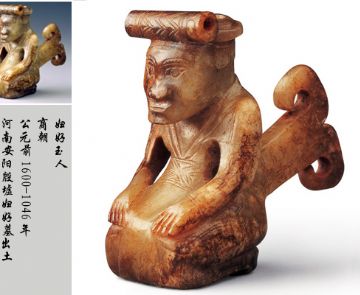 殷墟妇好玉人,黄褐色,圆雕跪坐式玉人。头顶有发,戴圆箍形冠,前沿出卷筒。双手扶膝,腰间饰套叠式菱格纹。臀部刻蚕纹,下肢有勾云纹,腰左倾向后斜出分枝尾式柄,神态庄重,造型奇特,是商代玉人的珍品。