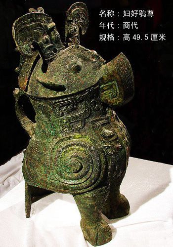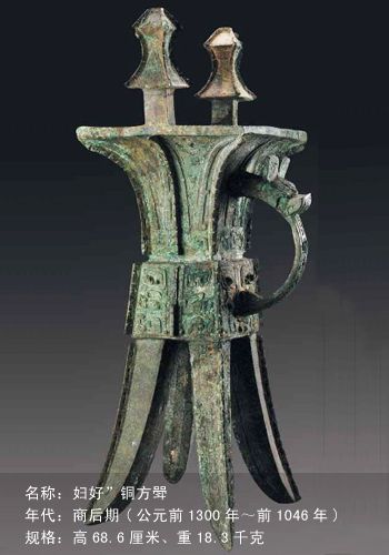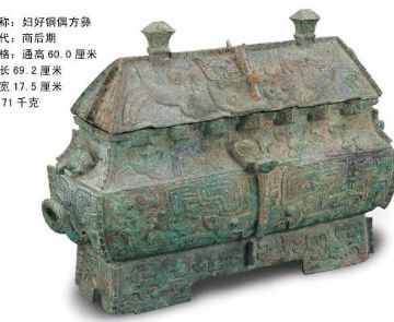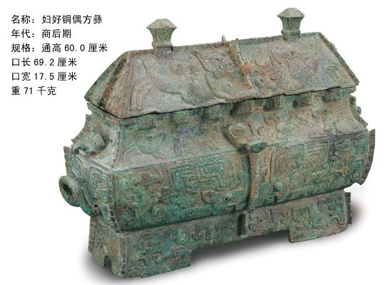 方彝(yi)是商王朝晚期的一种特殊酒器。妇好铜偶方彝造型凝重雄伟,纹饰精美富丽,铸造工艺高超,形制独特,为商周铜器中所仅见,是商代酒器中绝无仅有的罕见器形。器底铭“妇好”二字,通体以云雷纹做衬地,以浮雕枝法表现了兽面、鸱鹗、夔龙、大象等动物形象。