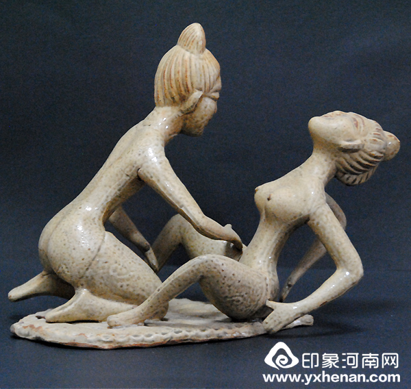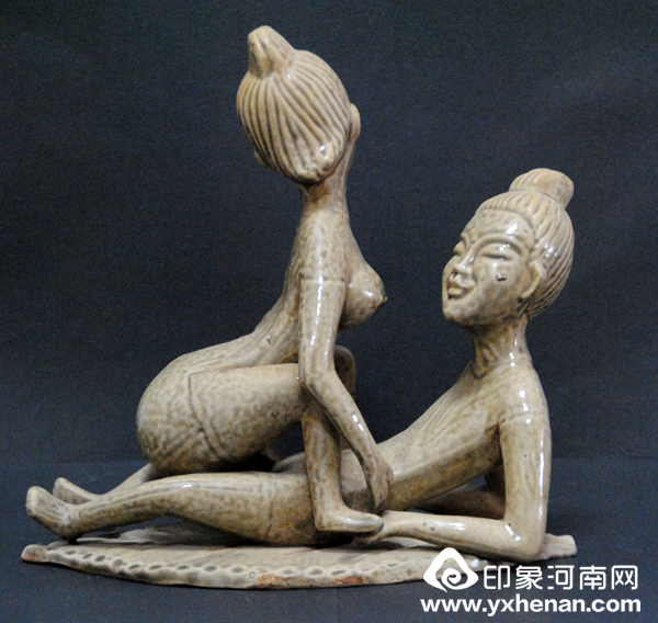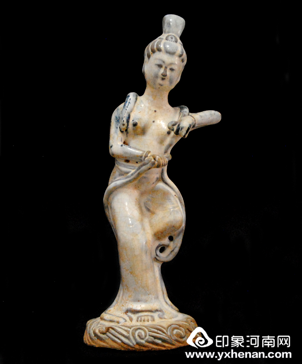 太广堂藏品《唐钧瓷白釉蓝彩·敦煌飞天仕女》所表现的仕女脸型丰满,姿态妩媚,明目皓齿。衣饰、发髻雍容华贵,人体比例适当。上身均裸露,下着长裙,衣带飘飞,宛如翩翩起舞的天宫仙女。