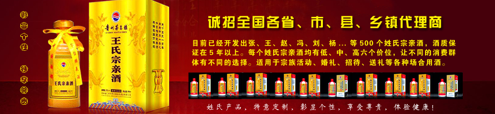 “百家姓酒业”面对的是广大消费群体,经营的是模式、理念、个性,做的是酒文化,是姓氏文化与酒文化结合的典范。目前已经开发出张、王、赵、冯、刘... 详细>>>
