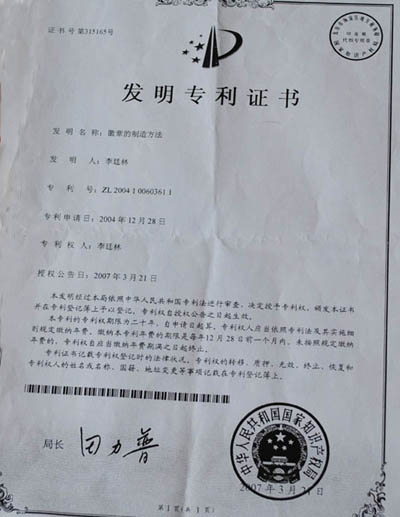 徽章制作专利的核心是采用“真空晶体”工艺,把介质放入多层的有机玻璃内,经熔、压成整体,因而不会被氧化而褪色变质,可永久保存。其特点是:彩色立体,写真新颖,不用金属与油漆,章内可嵌入金、银、宝石等名贵饰物,与电、声、光结合起来,制成高档精品,可馈赠、收藏,为徽章的工艺品化开辟了一条新途径。