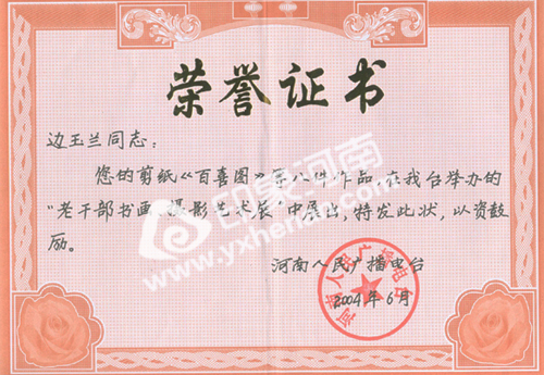 边玉兰,女,郑州人,剪纸艺人,从事剪纸四十多年,创作了《百喜图》、《十二生肖》等精美绝伦的作品。还入选了《古国丹青画卷之当代艺术家卷》。