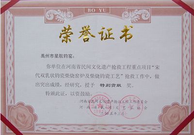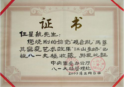 星航钧窑是一家专门研究、生产钧瓷的单位。由著名陶瓷工程师、钧瓷恢复的奠基人和主要领导者任坚老先生次子,现任中国古陶瓷委员会理事,中国古陶瓷工艺美术大师、禹州市钧瓷学会会长,中国古陶瓷学会会员任星航先生任董事长。星航美林钧瓷,是任星航与韩美林大师联合推出的艺术珍品。星航钧窑钧瓷在钧瓷界独家采用煤与液化气混和烧制是的煅烧新技术,集煤烧与气烧的优势于一体,使作品在浩瀚的钧瓷艺术品中独领风骚。不仅胎质坚实.品种考究.造型端庄.古朴典雅线条明快.做工严整,完全靠窑变浑然天成,丝毫无人工涂抹之痕迹,充分体现了入窑一色,出窑万彩的钧瓷艺术特色,并且更为淋漓尽致地再现了“宋钧”浑厚凝重.乳光莹润.五彩渗化.交相辉映的神韵特征,被全国古陶瓷委员会主任李辉炳教授誉之为“钧瓷魂”。
