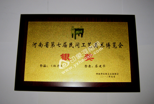 2008年4月,第一届郑州炎黄文化周,作品《仙鹤祝寿》荣获金奖。