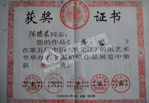 2003年作品《舞蹈》参展“第五届中国剪纸艺术节”获金奖,并获“中国剪纸德艺双馨奖”