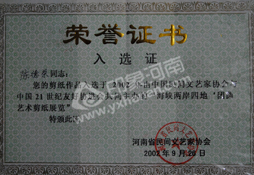 2002年作品入选海峡两岸四地团圆剪纸艺术展览