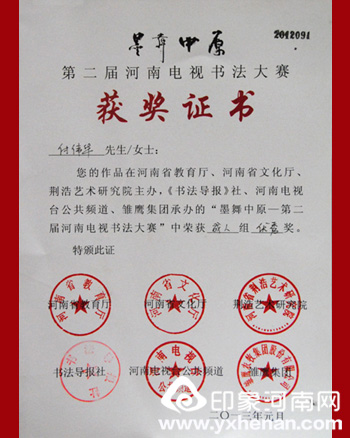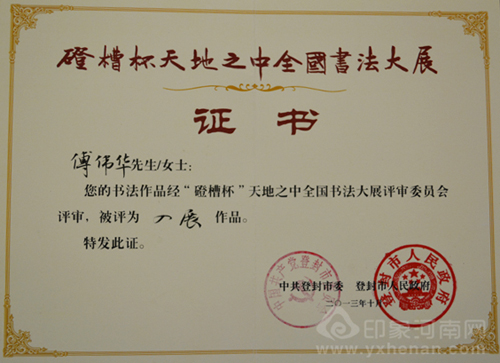 傅伟华入展“磴槽杯”天地之中全国书法大展入展证书