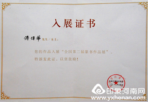 傅伟华入展“全国第二届篆书作品展”入展证书
