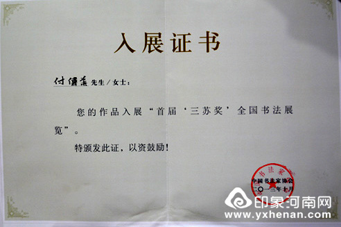 傅伟华入展“首届‘三苏奖’全国书法展览”入展证书