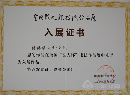 傅伟华入展全国“铁人杯”书法作品展入展证书