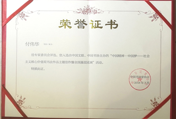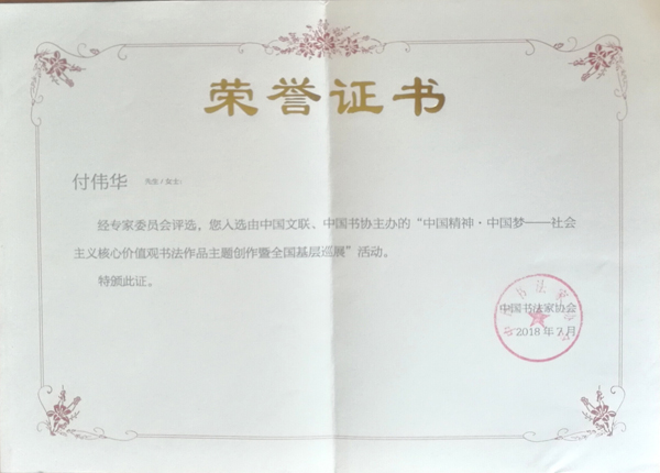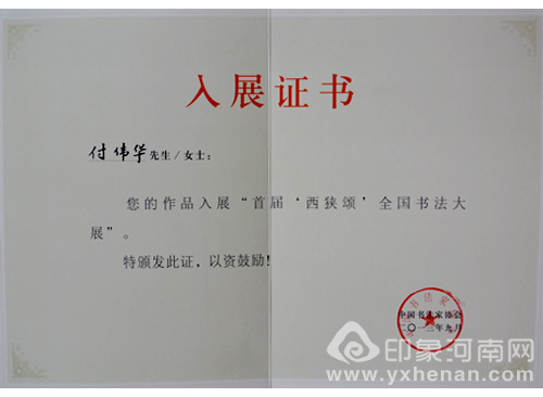 傅伟华入展全国“首届‘西狭颂’”全国书法大展入展证书