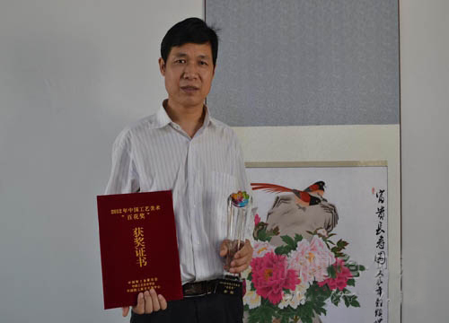 - 2013-7-23· 淮滨县布雕画发明人郑镇怀获“亚洲工艺美术大师”称号