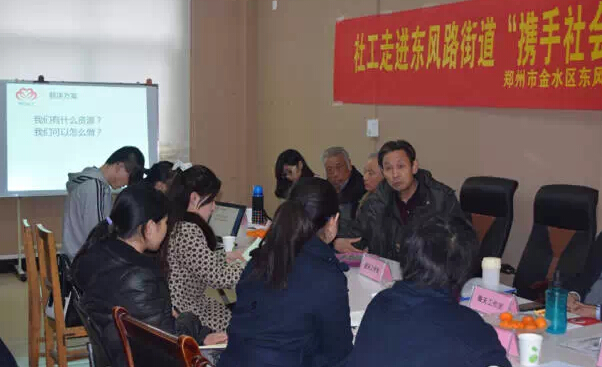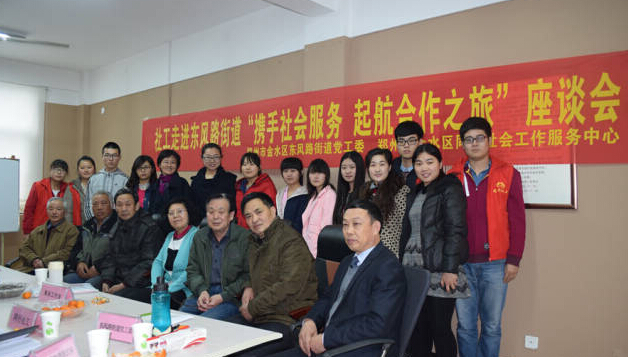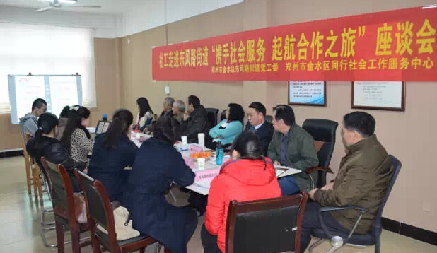 为了宣传社工知识、理念,促进民间公益组织与党政单位之间的联系和沟通,2015年3月19日下午,由郑州市金水区同行社会工作服务中心主办,郑州市东风路街道党工委协办的“携手社会服务,起航合作之旅”座谈会在东风路街道办红色家园四楼举行。东风路街道党工委两新党组织赵宗廷书记,李久成副书记,同行社会工作服务中心法人、理事长王莹,蓝天工作室代表邹蓝天,海天工作室吴曾录,阳光合唱团代表李学增,张满囤,大未来书画院代表傅伟华以及红帆船艺术中心、河南财经政法大学滴水公益、志愿者协会、社会工作者协会的代表参加了会议。