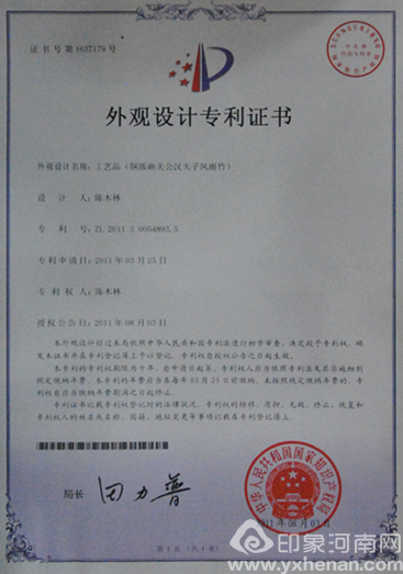印象河南网讯:2011年3月铜版雕刻家陈木林作品《关圣帝汉夫子风雨竹》荣获国家专利证书。