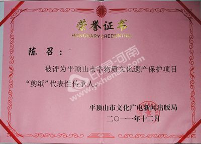 陈召,男,艺名陈子豪,河南省剪纸协会会员,河南省民间文艺家协会会员、河南省文化产业研究院特聘剪纸专家、从事民间剪纸艺术30多年,对剪纸有着深厚的功底和精湛的技艺,曾荣获河南省剪纸大赛一等奖、河南省农民书画大赛二等奖、轻工业学院艺术大赛特等奖、现任华北水利学院特聘教师,河南电视台、郑州电视台、大河报、东方今报、郑州晚报等十三家媒体联合报道。香港大公报、澳门华侨报、世界美国报都曾转载报道,其作品红楼梦--金陵十二釵、水浒--一百单八将已被郑州档案局收藏,二十米《老鼠娶亲》作品被河南博物院收藏,被艺术届誉为“中原神剪”。